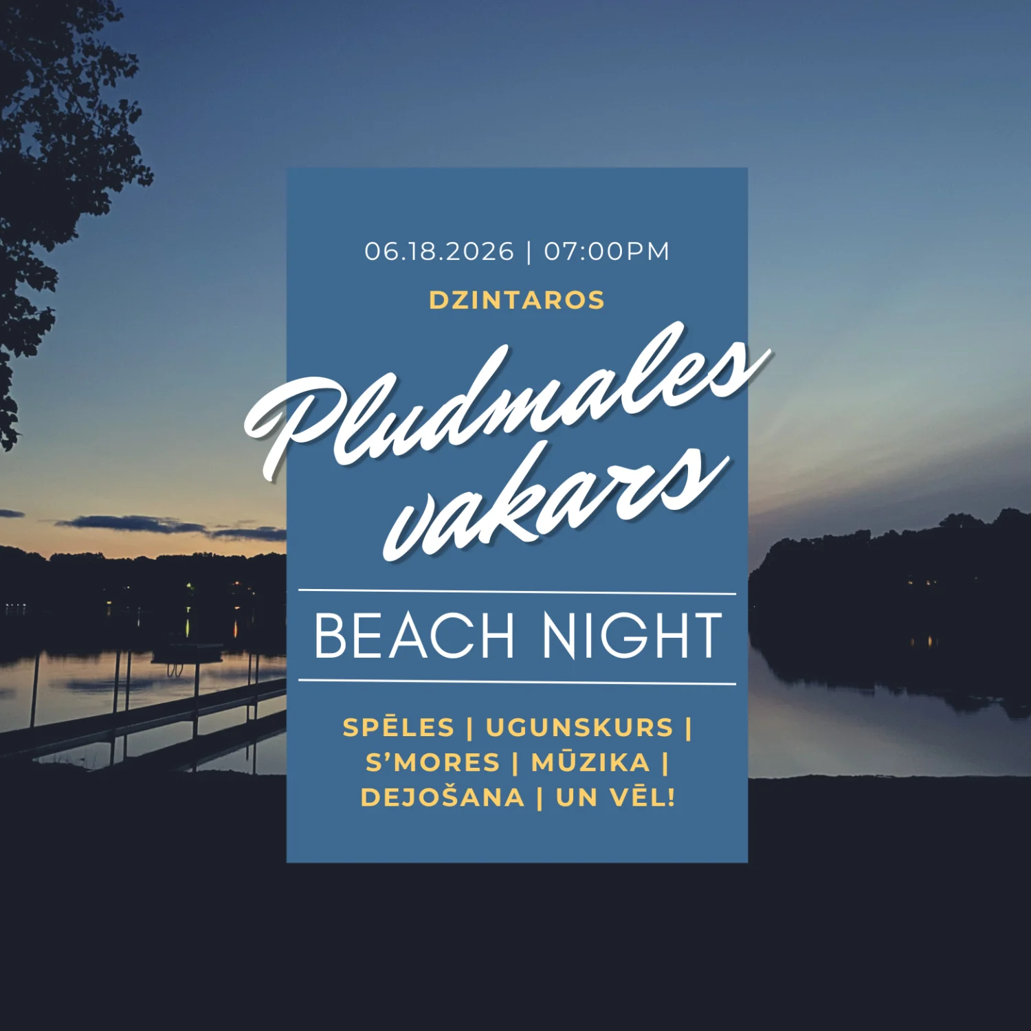 Vasaras vakars pludmalē ar spēlēm, ugunskuru, s’mores, mūziku un dejošanu. Ņem līdzi draugus un izbaudi vakaru pludmalē.