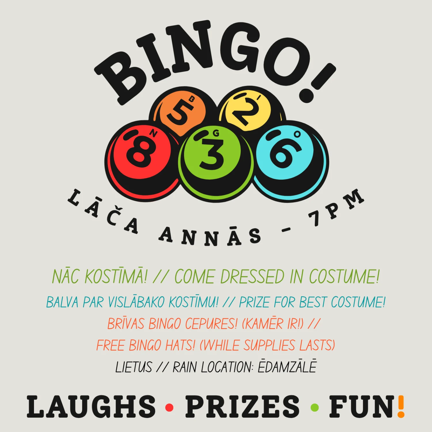 Jautrs bingo vakars ar balvām, smiekliem un draudzīgu sacensību — kostīmos! Nāc kostīmā, lai vinēt vislabākā kostīmu balvu, un brīvi bingo cepuri! (Kamēr mums ir!)