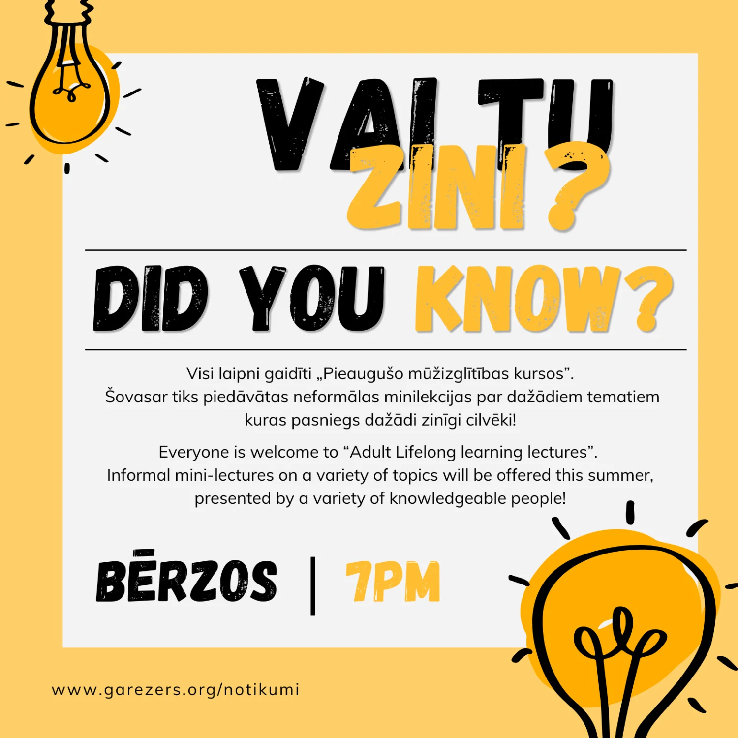 Visi laipni gaidīti „Pieaugušo mūžizglītības kursos”. Šovasar tiks piedāvātas neformālas minilekcijas par dažādiem tematiem kuras pasniegs dažādi zinīgi cilvēki!